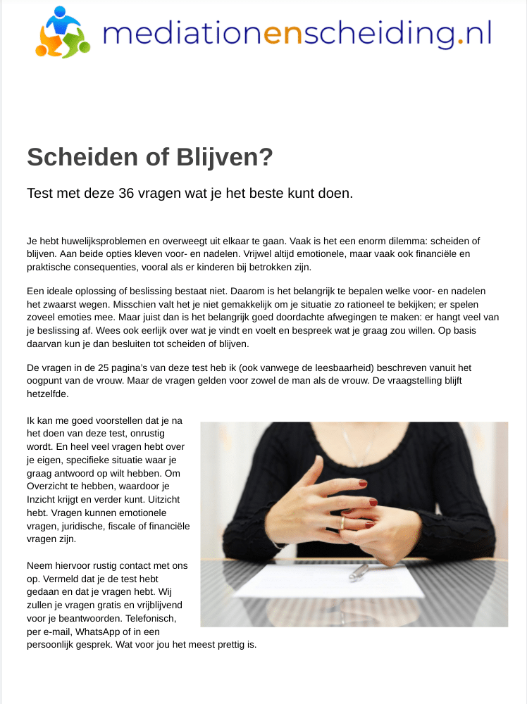 Vraagstukken over blijven of scheiden duidelijk uitgelegd. Bel voor een verhelderend gratis en vrijblijvend gesprek.